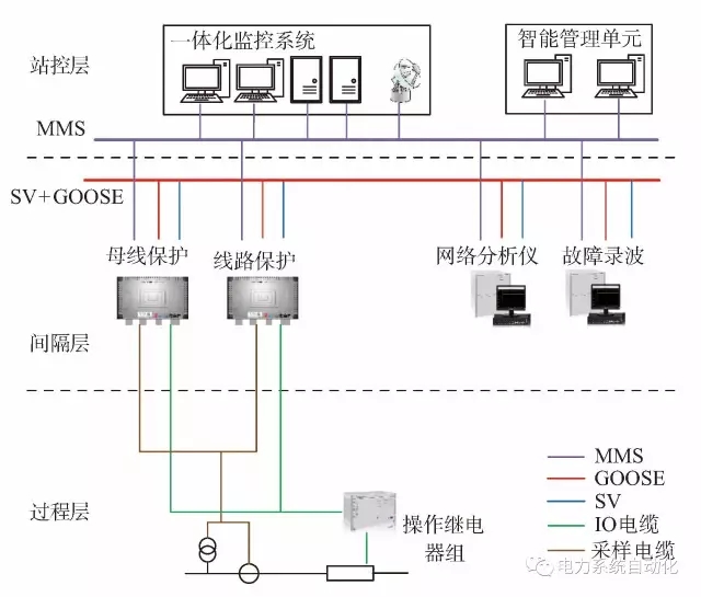 保護(hù)就地化變電站與當(dāng)前智能站都遵循IEC61850協(xié)議,均保持“三層兩網(wǎng)”的結(jié)構(gòu),但實(shí)現(xiàn)方式上發(fā)生了變革。首先,由于采用電纜直采直跳,取消了合并單元和智能終端,只需要操作繼電器組作為保護(hù)裝置與開關(guān)機(jī)構(gòu)的接口;而且間隔內(nèi)無網(wǎng)絡(luò),因而可取消過程層交換機(jī),只需在中心交換機(jī)增設(shè)端口即可,簡(jiǎn)化了過程層設(shè)備。保護(hù)裝置具備SV和GOOSE輸出功能,供站域保護(hù)、故障錄波和網(wǎng)絡(luò)分析等設(shè)備使用。此外,就地化安裝模式要求設(shè)備取消液晶面板,因此需要增設(shè)智能管理單元,連接于站控層網(wǎng)絡(luò)。智能管理單元對(duì)站內(nèi)就地化保護(hù)設(shè)備進(jìn)行界面集中展示、備份管理、保護(hù)設(shè)備在線監(jiān)視與診斷等功能。智能管理單元與不同廠家的保護(hù)裝置之間可實(shí)現(xiàn)互聯(lián)互通,對(duì)各廠家保護(hù)裝置采用統(tǒng)一的顯示和操作界面。