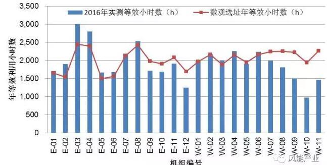 評(píng)估結(jié)果顯示,各機(jī)組2016年實(shí)測(cè)年等效利用小時(shí)數(shù)與微觀選址計(jì)算的年等效利用小時(shí)數(shù)對(duì)比如圖1所示。
