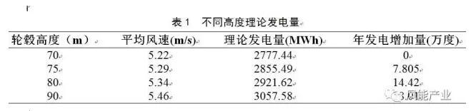 為論證W-10機(jī)組塔筒加高技改的可行性,采用激光雷達(dá)進(jìn)行為期75天的測(cè)風(fēng),測(cè)風(fēng)結(jié)果表明該機(jī)位處的風(fēng)切變?yōu)?.15。基于該機(jī)位的設(shè)計(jì)年平均風(fēng)速5.22m/s,結(jié)合實(shí)測(cè)風(fēng)切變,推算塔筒加高后,不同高度理論年發(fā)電量如表1所示。