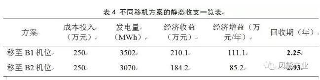 結(jié)合風(fēng)電場(chǎng)地形、道路和施工條件,在不考慮惡劣天氣無(wú)法施工和各種不可抗力的條件下,移機(jī)所需投入成本約為250萬(wàn)元,主要包括:基礎(chǔ)及基礎(chǔ)環(huán)約50萬(wàn)元,箱變基礎(chǔ)約50萬(wàn)元、集電線路按一千米計(jì)算約50萬(wàn)元,拆機(jī)、運(yùn)輸、人工及吊裝費(fèi)約100萬(wàn)元。綜上所述,不同移機(jī)方案的收支表如表4所示。