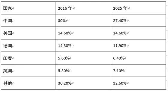 2016-2025年全球主要國家風(fēng)電運(yùn)維市場份額變動預(yù)測