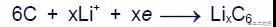 一個電源給電池充電,此時正極上的電子e從通過外部電路跑到負極上,正鋰離子Li+從正極“跳進”電解液里,“爬過”隔膜上彎彎曲曲的小洞,“游泳”到達負極,與早就跑過來的電子結(jié)合在一起。此時: