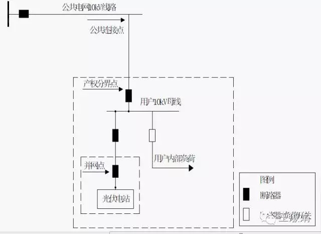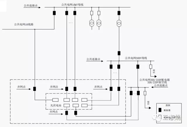 接入10kV的分布式光伏發(fā)電項(xiàng)目,形成雙重檢測和保護(hù)策略。380V電壓等級(jí)由逆變器實(shí)現(xiàn)防孤島檢測和保護(hù)功能,但在并網(wǎng)點(diǎn)應(yīng)安裝易操作,具有明顯開斷指示的開斷設(shè)備。