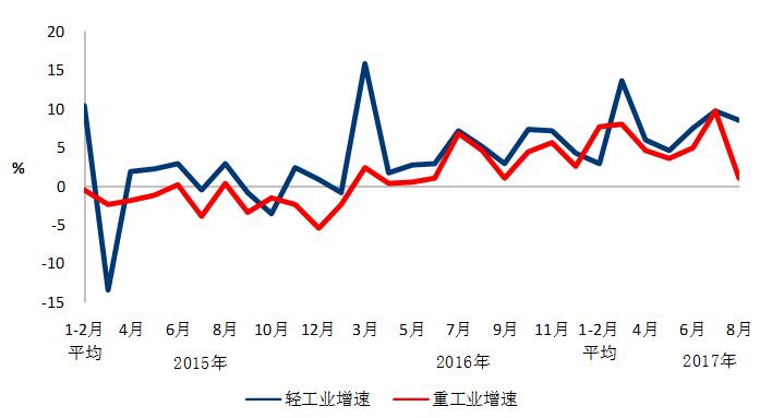 圖2 2015年以來分月輕、重工業(yè)用電量增速情況