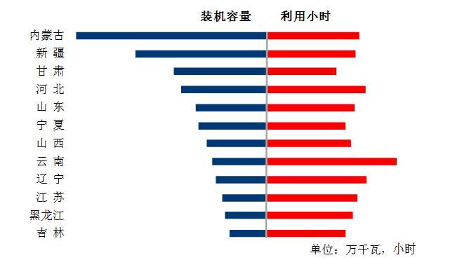 圖6 1-8月份風(fēng)電裝機(jī)較多省份風(fēng)電裝機(jī)容量和設(shè)備利用小時