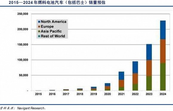 Navigant Research預(yù)測(cè)到2021年,全球燃料電池汽車(包括巴士)銷量將超過(guò)5萬(wàn)輛,到2024年全球燃料電池車大規(guī)模量產(chǎn)時(shí),年銷量將達(dá)到22.8萬(wàn)輛。預(yù)計(jì)總市場(chǎng)規(guī)模將達(dá)到456億元。