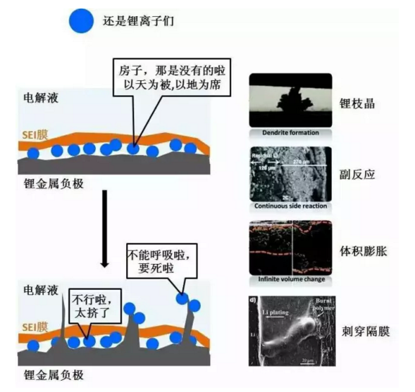 但是,隨著沉積的鋰金屬越來越多,地方變得擁擠了(沒辦法,沒房么,混著住唄),同時(shí)會(huì)產(chǎn)生極度不均勻的鋰金屬表面形貌,行業(yè)中稱這種現(xiàn)象為鋰枝晶生長(zhǎng)。更加可怕的是,鋰離子們特別喜歡在有鋰枝晶的地方扎堆,讓局部的鋰枝晶越長(zhǎng)越大,最終撐破SEI膜。當(dāng)這種情況發(fā)生的時(shí)候,悲催的一部分鋰金屬被暴露在充滿電解液的世界,就像坐著火箭的人沖出大氣層,卻忘了穿宇航服,直接就“立地成佛”了。