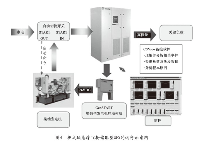 在傳統(tǒng)UPS供電系統(tǒng)中,當(dāng)電力發(fā)生中斷時(shí),蓄電池會(huì)支撐系統(tǒng)正常運(yùn)轉(zhuǎn),與此同時(shí),柴油發(fā)動(dòng)機(jī)開(kāi)始啟動(dòng),以此保證數(shù)據(jù)中心主機(jī)正常工作、空調(diào)連續(xù)運(yùn)轉(zhuǎn)。蓄電池型UPS在此過(guò)程中,提供了“分鐘級(jí)”的電力供電。而飛輪儲(chǔ)能型UPS受制于機(jī)械儲(chǔ)能,僅僅能夠提供30s到1min電力供電,這也是飛輪UPS被詬病的主要原因。然而,專(zhuān)家指出,如今,市電電源的可靠性達(dá)到99.9%,有些重要的負(fù)載都采用雙路市電供電,市電的可靠性可以說(shuō)已經(jīng)達(dá)到了99.99%。萬(wàn)一市電中斷,后備電源的可靠性也可以達(dá)到99.9%,從市電到后備電源的切換,在技術(shù)上只需要10s的時(shí)間,這是一個(gè)公開(kāi)的標(biāo)準(zhǔn)。目前,歐洲已經(jīng)將這個(gè)時(shí)間定了8s。可以斷定,飛輪儲(chǔ)能型UPS能提供30s的電力完全能夠滿足從市電到后備電源的可靠切換的要求。圖4給出了柜式磁懸浮飛輪儲(chǔ)能型UPS的運(yùn)行示意圖。