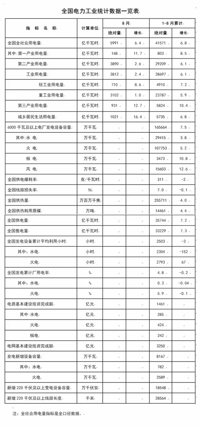 國(guó)家能源局發(fā)布1-8月份全國(guó)電力工業(yè)統(tǒng)計(jì)數(shù)據(jù)