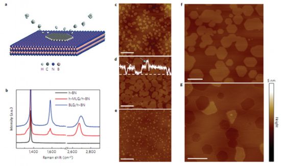 圖1:石墨烯在六方氮化硼上的外延生長示意圖以及AFM、拉曼的表征。
