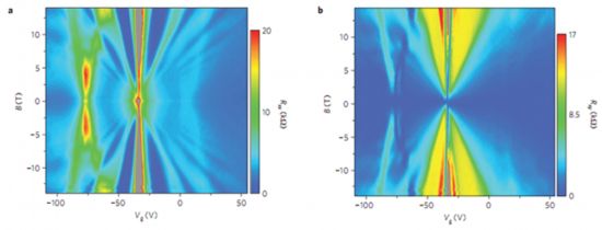 圖5:單層石墨烯的徑向電阻和霍爾電阻隨門電壓和磁場的扇形圖。