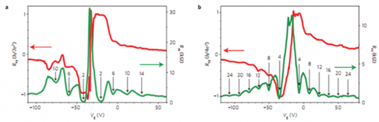 圖4:單層和雙層石墨烯的在~1.6K下的量子霍爾輸運曲線。