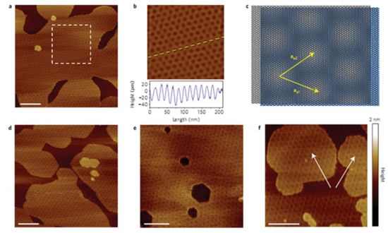 圖2:通過AFM表征可以清晰地在各種不同生長階段的樣品觀測到~15nm的石墨烯二維超晶格結構。