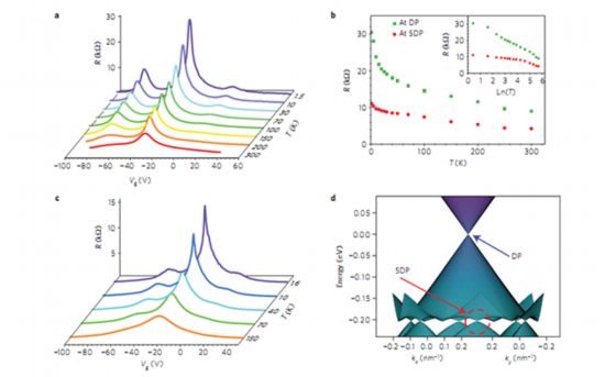 圖3:石墨烯/六方氮化硼的電學輸運隨溫度的變化曲線,超晶格狄拉克點的出現(xiàn)以及相應的能帶結構。