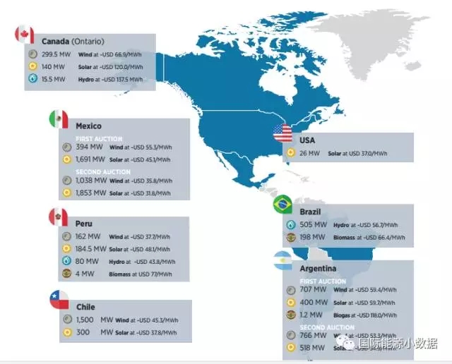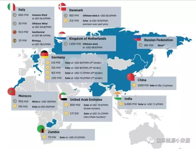 中國(guó)儲(chǔ)能網(wǎng)訊:根據(jù)國(guó)際可再生能源署最新發(fā)布的《可再生能源競(jìng)價(jià)分析報(bào)告》,2016年各國(guó)可再生能源項(xiàng)目(包括陸上風(fēng)電、海上風(fēng)電、光伏、水電、生物質(zhì)發(fā)電、地?zé)幔┳畹透?jìng)價(jià)如下圖所示:
