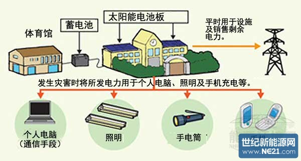 平時(shí)會將所發(fā)電力用于學(xué)校設(shè)施,或進(jìn)行蓄電,同時(shí)銷售剩余電力。發(fā)生災(zāi)害時(shí),會將所蓄積的電力供應(yīng)給個人電腦及照明裝置,或者用于手機(jī)充電等用途。另外,采用的系統(tǒng)還可在因?yàn)?zāi)害而停電時(shí),利用蓄電池電力,自動重新啟動太陽能發(fā)電系統(tǒng)等。