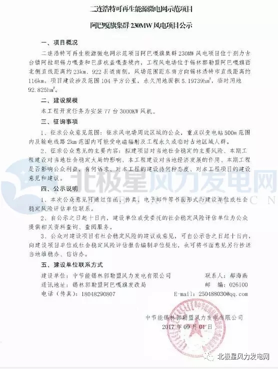 中國(guó)儲(chǔ)能網(wǎng)訊:北極星風(fēng)力發(fā)電網(wǎng)獲悉,錫林郭勒盟發(fā)展和改革委員會(huì)近日發(fā)布《二連浩特可再生能源微電網(wǎng)示范項(xiàng)目阿巴嘎旗集群230MW風(fēng)電項(xiàng)目公示》,該工程開(kāi)發(fā)任務(wù)為安裝77臺(tái)3000kw風(fēng)機(jī)。以下為公示原文: