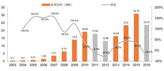 2003-2016 年國內(nèi)風電新增裝機情況