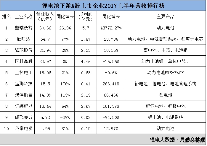 中國(guó)儲(chǔ)能網(wǎng)訊:據(jù)統(tǒng)計(jì),A股市場(chǎng)上主要產(chǎn)品為鋰電池的企業(yè)共有10家(比亞迪計(jì)入整車企業(yè))。其中,堅(jiān)瑞沃能上半年以營(yíng)收60.66億元拔得頭籌,欣旺達(dá)上半年?duì)I收54.7億元位列第二,駱駝股份上半年?duì)I收31.94億元位居第三。