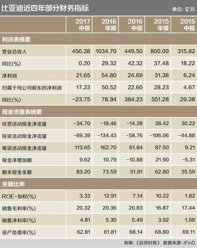 據(jù)該公司最新披露的半年報顯示,2017年上半年比亞迪實現(xiàn)營業(yè)收入為450.38億元,同比微增0.20%,相對于去年同期42.32%的營收同比增長幅度著實遜色不少。