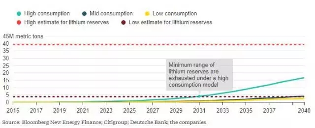 下圖來自彭博社金融的信息,是花旗銀行和德意志銀行等公司根據(jù)對鋰消費(fèi)程度的不同,對鋰礦資源在何時(shí)會(huì)枯竭的預(yù)測。
