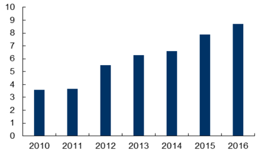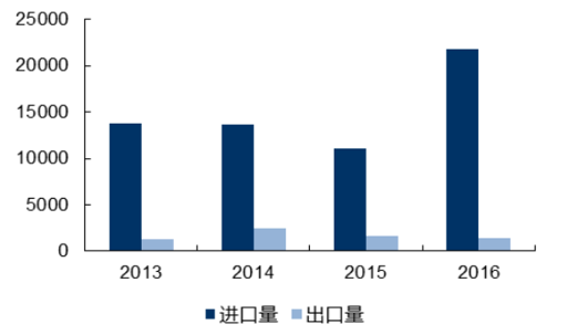 多年來,我國碳酸鋰生產(chǎn)規(guī)模無法滿足國內(nèi)市場需求,且產(chǎn)品主要集中在工業(yè)級碳酸鋰、氫氧化鋰等生產(chǎn)難度小、附加值低的傳統(tǒng)鋰產(chǎn)品,高端鋰產(chǎn)品部分依賴進口,2016年碳酸鋰進口量2.12萬噸,同比增長了97%。