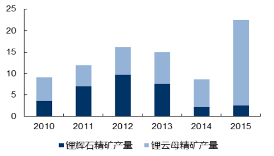 2015年鋰輝石精礦產(chǎn)量僅為鋰云母的1/8