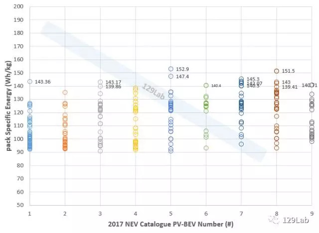 下圖是每批NEV目錄中對(duì)應(yīng)PV-BEV的電池包比能量(Wh/kg)數(shù)據(jù)(這里面絕大多數(shù)都是NMC材料,少量是LFP材料和LMO材料,這里不區(qū)分材料,僅看最終的電池包數(shù)據(jù))。從圖中可以看到,所有第1-9批目錄中的BEV乘用車(chē)PV的電池包比能量都>90Wh/kg。從數(shù)據(jù)點(diǎn)分布疏密粗略地看,介于90-100Wh/kg的數(shù)量在后面幾批目錄中逐漸減少,而分布在100-110Wh/kg和120-130Wh/kg的數(shù)量明顯居多?!?40Wh/kg的數(shù)據(jù)已經(jīng)在圖中標(biāo)示出來(lái),這部分占比目前還不高。而最高的比能量已經(jīng)達(dá)到了152Wh/kg水平。