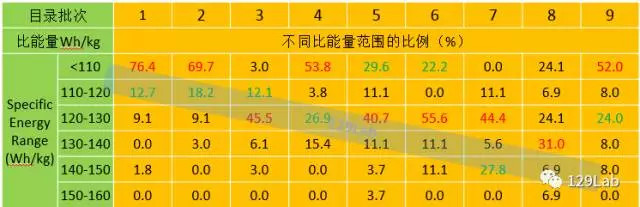 下表具體分析了每個(gè)目錄批次中,不同比能量范圍的占比(紅色數(shù)字占比最高,綠色其次)。從1-2、4、9批的數(shù)據(jù)來(lái)看,電池包能量<110Wh/kg的占比最高,但除了1-2批占比接近或大于70%,第4、9批在<110Wh/kg這一范圍的占比已經(jīng)下滑到50%左右,下滑的比例被分?jǐn)偟礁叩谋饶芰糠秶?,從?cè)面說(shuō)明3-9批電池包比能量數(shù)據(jù)有了明顯提高。第3批占比最高的是在120-30Wh/kg,這個(gè)范圍的占比在后面的第5、6、7批目錄中同樣保持最高。第8批占比最高的比能量已經(jīng)上升到130-140Wh/kg。值得注意的是,除了第2、4批之外,其他批次都出現(xiàn)了比能量介于140-150Wh/kg之間的電池包。特別是第5、8批目錄,出現(xiàn)了比能量在150-160Wh/kg之間的電池包,這也是目前比較高的電池包比能量數(shù)據(jù)了。從整體數(shù)據(jù)來(lái)看,>120Wh/kg今后可能會(huì)成為下一階段BEV電池包的目標(biāo)、并逐漸成為常態(tài),這樣才能更好的支撐>300km長(zhǎng)續(xù)駛里程的BEV乘用車(chē)市場(chǎng)。