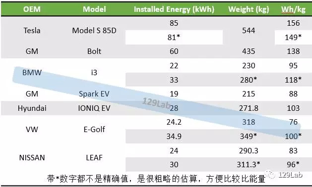 下面例舉國(guó)外市場(chǎng)上的幾款BEV乘用車(chē)電池包的比能量數(shù)據(jù),做一下對(duì)比。除了可以在網(wǎng)絡(luò)上直接查到的公開(kāi)數(shù)據(jù)之外,以下數(shù)據(jù)作了其中,Tesla Model S 85D,據(jù)外國(guó)玩家的BMS破解發(fā)現(xiàn),ModelS 85D實(shí)際能量可能并不是85kWh,而是81kWh,這樣計(jì)算的話比能量為~149Wh/kg。BMW i3的33kWh版本,重量信息不明確,有德國(guó)媒體報(bào)道大約增加50kg,以這個(gè)計(jì)算比能量為~118Wh/kg。大眾2015 e-Golf電芯從25Ah升級(jí)到36Ah之后,大約從24.2kWh增加到34.9kWh,比能量大約在100Wh/kg左右(這里沒(méi)有精確的重量數(shù)據(jù),做了個(gè)估算)。NISSAN LEAF的30kWh版本,媒體報(bào)道重量大約增加21kg,則比能量為~96Wh/kg。這里除了Tesla和GM的電池包比能量數(shù)據(jù)較高之外,其他幾家OEM的這個(gè)數(shù)據(jù)并不突出。