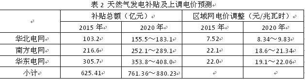 根據(jù)目前各省采取的補貼和電價疏導(dǎo)兩種方式,對我國天然氣發(fā)電裝機較集中的華北電網(wǎng)、南方電網(wǎng)和華東電網(wǎng)三個區(qū)域電網(wǎng),對天然氣發(fā)電上網(wǎng)電價高出燃煤標(biāo)桿電價部分采用政府補貼和上調(diào)電價全網(wǎng)平攤消化兩種方案進行測算,結(jié)果見表2。