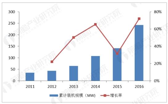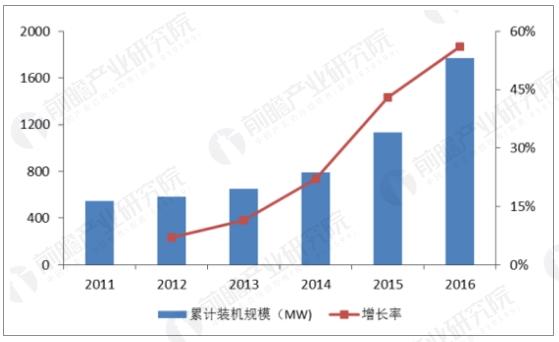 中國的儲能于2011年起步,近幾年保持著強勁的增長態(tài)勢,截至2016年底,中國投運電化學儲能項目累計裝機規(guī)模為243.0MW,同比增長72%,新增裝機呈現(xiàn)加速增長的狀態(tài)。自2012年起,中國投運的電化學儲能項目的累計裝機規(guī)模處于穩(wěn)步增長階段,年復合增長率(2012-2016)54%。2016年,中國新增投運電化學儲能項目的裝機規(guī)模為101.4MW,同比增長299%。2016年新增規(guī)劃、在建中的電化學儲能項目的裝機規(guī)模為845.6MW,預計短期內中國電化學儲能裝機規(guī)模還將保持高速增長。