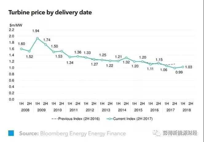 風(fēng)機造價從2009年上半年的每兆瓦194萬美元跌至2017年下半年的每兆瓦99萬美元,下降了49%。而風(fēng)機發(fā)電平準價格則從2009上半年的每兆瓦時914美元/年降至2017下半年的每兆瓦時300美元/年,下降了68.2%。