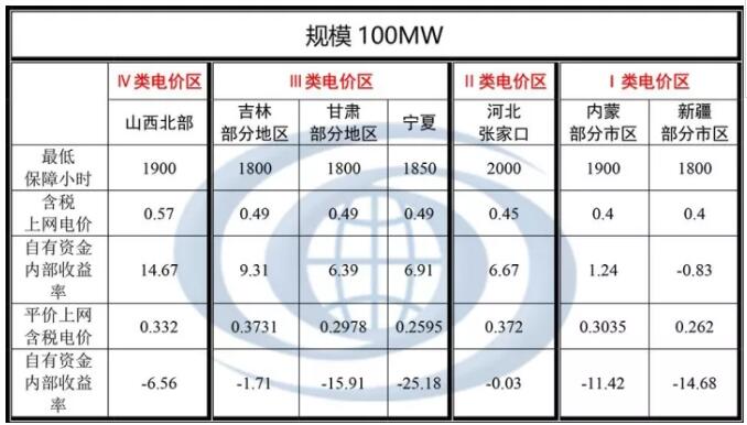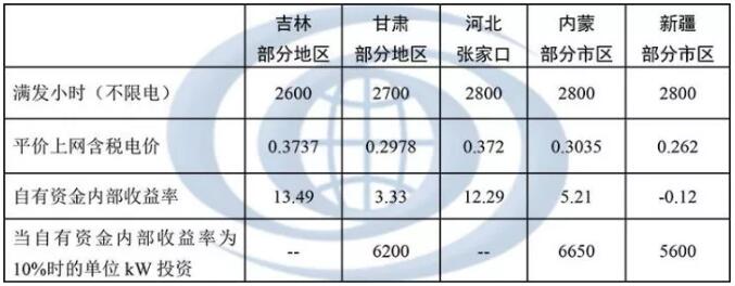 由上表測算可以看出,2018年電價調整后,部分風電場已經(jīng)很難滿足自有資金內部收益10%的要求,近幾年內更無法滿足平價上網(wǎng)條件。若要實現(xiàn)平價上網(wǎng),以下對一些投資少、資源好的地區(qū)在不限電情況下進行平價上網(wǎng)分析,包括吉林、甘肅、張家口、內蒙、新疆。
