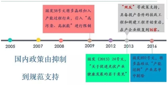 中國光伏產(chǎn)業(yè)是從2005年開啟的,歷經(jīng)12年已成為全球最大的需求市場和生產(chǎn)地。在12年中,2009年的國發(fā)38號文將多晶硅歸入了產(chǎn)能過剩行業(yè),做了“高耗能和高污染”產(chǎn)業(yè)嚴(yán)格限制,市場備受打擊。而2013年時,國發(fā)24號文再次提出了“關(guān)于促進(jìn)光伏產(chǎn)業(yè)健康發(fā)展的若干意見”,加之“雙反”等政策的出現(xiàn),讓具備投產(chǎn)條件的技改工程和新建工程得以重見天日,多晶硅在產(chǎn)企業(yè)也恢復(fù)至16家。2016年,國發(fā)892號文件又將多晶硅從產(chǎn)能過剩的產(chǎn)業(yè)名單中剔除,上下游市場振奮不已。