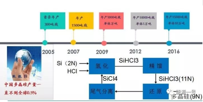 國內(nèi)多晶硅取得了哪些進(jìn)步呢?從規(guī)模經(jīng)濟(jì)技術(shù)角度看,2005年時,首條年產(chǎn)300噸生產(chǎn)線正式下線。2007年和2009年,市場上也分別出現(xiàn)了1500噸和5000噸的生產(chǎn)線,單體產(chǎn)能高達(dá)萬噸。