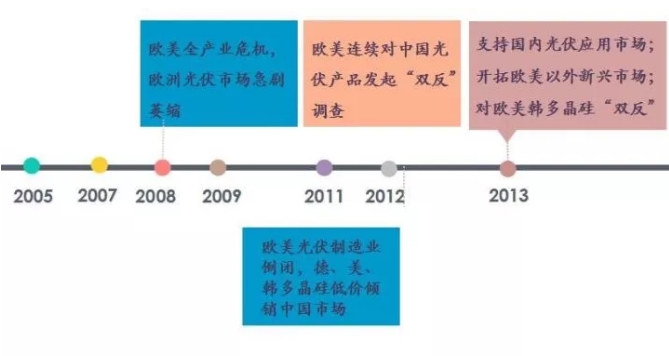 而另一方面,國際經(jīng)濟(jì)金融和貿(mào)易政策也深刻影響了行業(yè)走勢,使整體市場格局顯現(xiàn)了較大變化。2008年時,歐美全產(chǎn)業(yè)危機(jī)爆發(fā),歐洲光伏市場急劇萎縮,也就是那時中國多晶硅的售價全線潰退,每公斤上百美元的多晶硅跌破了30美元。歐美相關(guān)機(jī)構(gòu)也連續(xù)對中國光伏產(chǎn)品發(fā)起了“雙反”調(diào)查。直至2013年時,支持中國光伏應(yīng)用市場的各項(xiàng)政策開啟,歐美以外新興市場成為企業(yè)出海首選、對歐美韓的中國多晶硅“雙反”等政策也賦予了行業(yè)新的生命力。