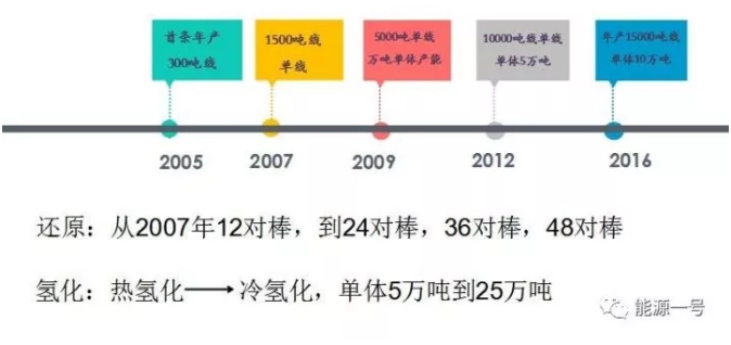 而2012年和2016年,單體多晶硅的產(chǎn)能也從5萬噸升至10萬噸。還原技術(shù)則由2007年的12對棒上升至24對棒、36對棒、48對棒。氫化技術(shù)以熱氫化為主轉(zhuǎn)變?yōu)楦h(huán)保節(jié)能的冷氫化。
