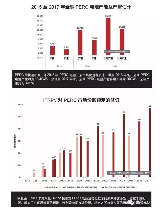 《PERC電池???017》預估,截至2016年底,PERC產(chǎn)線全球裝機產(chǎn)能約13.4GW,基于許多工廠還在安裝試機階段,我們估計2016年實際產(chǎn)量約為7.9GW。PERC的產(chǎn)能擴張仍在繼續(xù),到2017年底將達到接近20GW的產(chǎn)線裝機容量,屆時PERC電池產(chǎn)量將達到約14GW。