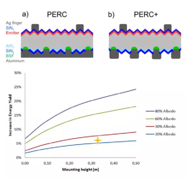 在2015年,SolarWorld與其合作研究結構ISFH報道了雙面PERC(PERC+)產(chǎn)品,其電池背面使用了局部鋁柵線,取得了與單面電池相當?shù)恼孓D換效率,雙面率達到65%。相比之前出現(xiàn)的雙面電池,沒有使用高成本的銀柵線與N型硅片,也沒有背面擴散環(huán)節(jié),電池成本與單面PERC電池成本相當,展現(xiàn)出非常好的應用前景。