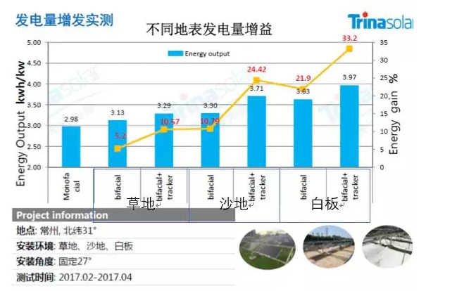 天合光能的雙面組件在17年2~4月在草地、沙地和白板的地面反射條件下相對常規(guī)組件可分別多發(fā)電5.2%、10.79%、21.9%;配合跟蹤支架則多發(fā)電結果變?yōu)?0.57%、24.42%、33.2%。發(fā)現(xiàn)雙面PERC組件配合跟蹤支架可實現(xiàn)1+12的效果。