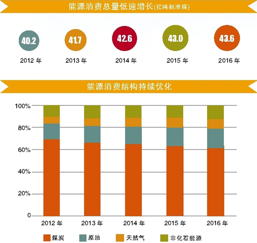 五年回首,能源生產(chǎn)轉(zhuǎn)型升級(jí),消費(fèi)革命生生不息。2016年,全國能源消費(fèi)總量為43.6億噸標(biāo)準(zhǔn)煤,其中,煤炭消費(fèi)比2012年下降6.5個(gè)百分點(diǎn);清潔能源消費(fèi)(含天然氣)比重達(dá)到19.7%,比2012年提高5.2個(gè)百分點(diǎn)。電源和電網(wǎng)建設(shè)蹄疾步穩(wěn)、煤電超低排放改造啟動(dòng)實(shí)施、非化石能源投資與日俱增、天然氣供應(yīng)不斷擴(kuò)大……高能效、低污染的清潔能源消費(fèi)比重節(jié)節(jié)攀升,能源消費(fèi)品種結(jié)構(gòu)持續(xù)優(yōu)化。