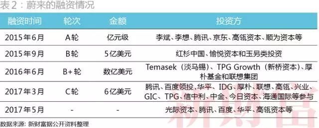 在這其中,不僅BAT三巨頭中的騰訊與百度不約而同地相中了蔚來汽車,京東劉強東、小米雷軍、汽車之家創(chuàng)始人李想、順為資本、高瓴資本、紅杉資本、聯(lián)想集團等紛紛為其投入了真金白銀。2017年C輪融資過后,蔚來的估值已達200億元(表2)。
