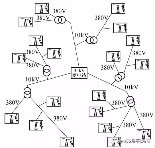 其次,傳統(tǒng)煤層氣交流供電系統(tǒng)采用35kV變電站、10kV高壓輸電和380V低壓配電三級供電模式,如圖1所示,需要大量使用變壓器,考慮到煤層氣抽采機(jī)負(fù)載數(shù)量及容量的實際情況,選用配電變壓器容量多為100~160kV·A,且配電用變壓器一般工作在非經(jīng)濟(jì)運(yùn)行區(qū),這就大大加劇了有功和無功損耗。