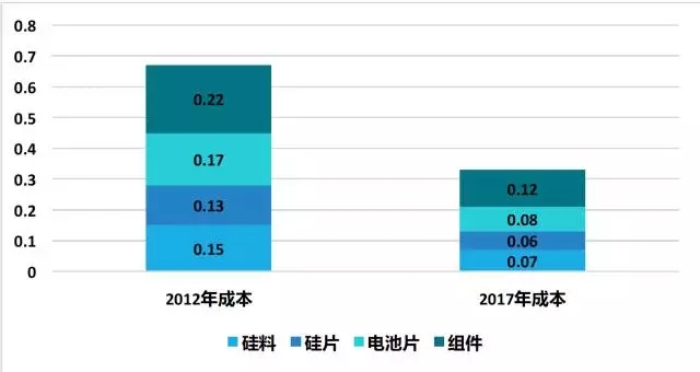 組件、系統(tǒng)、逆變器、電價(jià)8年分別下降90%、88.3%、91.5%、77.5%;2016-2017年,組件價(jià)格下降幅度也達(dá)到近21%,系統(tǒng)的設(shè)備投資成本也下降至5元/瓦的水平。