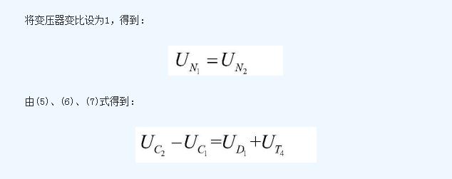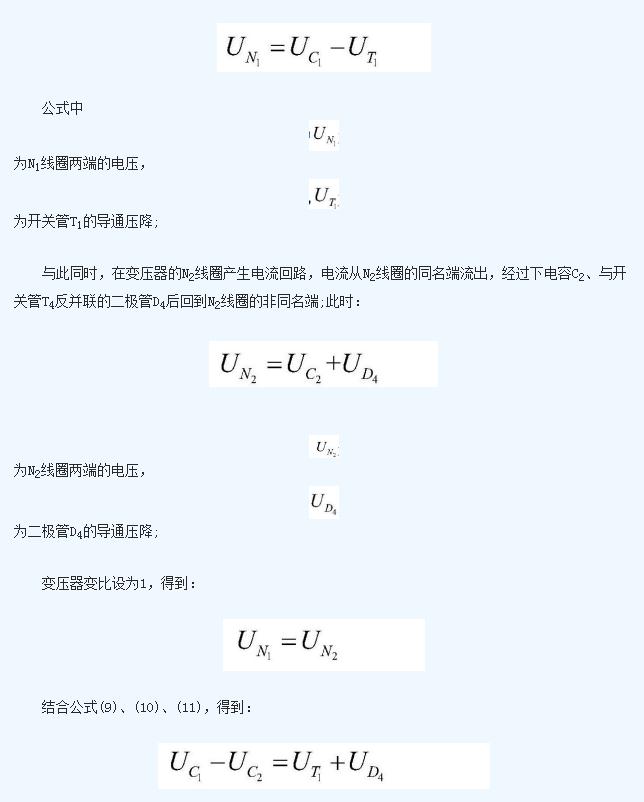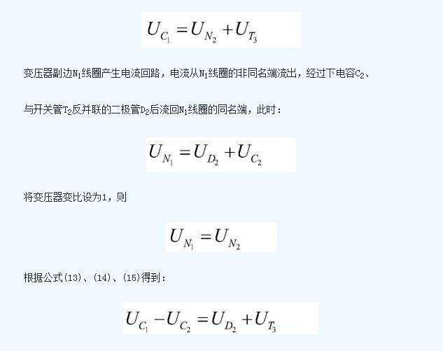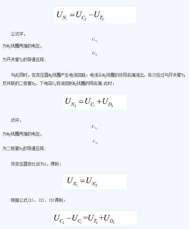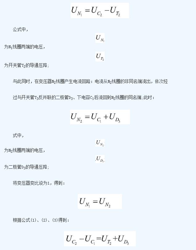 即上電容C1的電壓值與下電容C2的電壓值之差即為開關(guān)管T2的導(dǎo)通壓降與二極管D3的導(dǎo)通壓降之和;下電容C2在該工作狀態(tài)中不斷放出能量,能量被N1線圈吸收后傳遞給N2線圈,然后由N2線圈通過二極管D3不斷向電容上C1充電;這個過程中,C2放電,C1充電, 不斷減小, 不斷增加,二者電壓差減少;