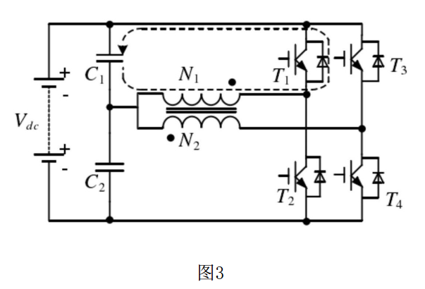 (3)所述③ 狀態(tài)在② 狀態(tài)的續(xù)流完成后開始,此狀態(tài)下,開關(guān)管T4導(dǎo)通,T1、T2、T3關(guān)斷;電流從下電容C2正端流出,經(jīng)過N2線圈、開關(guān)管T4后流回下電容C2的負(fù)端,此時: