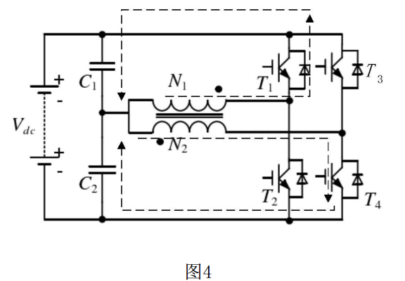 (3)所述③ 狀態(tài)在② 狀態(tài)的續(xù)流完成后開始,此狀態(tài)下,開關(guān)管T4導(dǎo)通,T1、T2、T3關(guān)斷,電流流向如圖4所示。電流從下電容C2正端流出,經(jīng)過N2線圈、開關(guān)管T4后流回下電容C2的負(fù)端,此時: