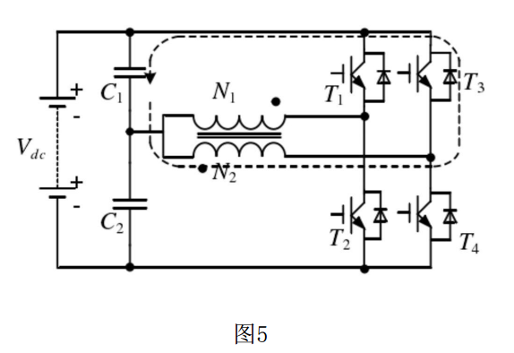 (1)⑤ 狀態(tài)時,開關(guān)管T1導(dǎo)通,T2、T3、T4關(guān)斷;電流從上電容C1的正端流出,經(jīng)過開關(guān)管T1、N1線圈后流回上電容C1的負(fù)端;根據(jù)基爾霍夫方程得到: