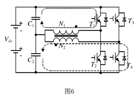 (2)⑤ 狀態(tài)后是⑥ 狀態(tài),該狀態(tài)下電流所有開關(guān)管全部關(guān)斷,該階段為⑤ 狀態(tài)的續(xù)流階段,電流從N1線圈的非同名端流出,經(jīng)過下電容C2、二極管D2后流回繞組N1線圈的同名端,該電流大小不斷減小,最終為0;